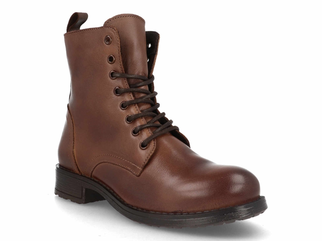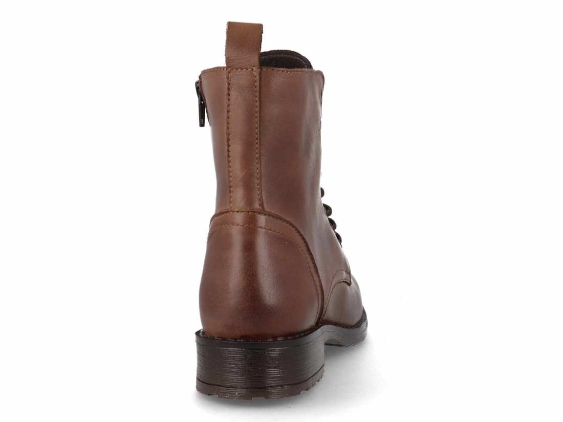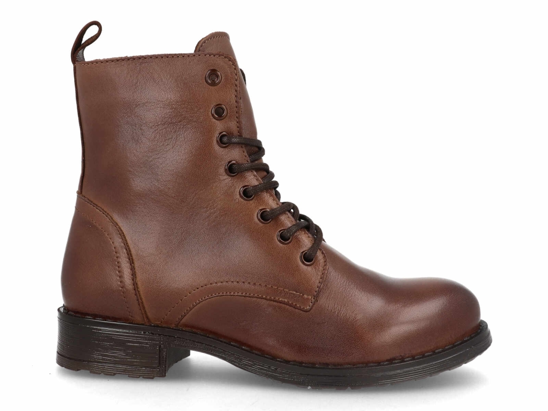Su diseño superior mantiene la esencia robusta del botín tipo militar, con un acabado liso de aspecto premium y una construcción resistente que asegura durabilidad y firmeza. El sistema de cordones con ojales metálicos permite un ajuste personalizado, aportando un toque urbano y moderno que combina perfectamente con todo tipo de looks, desde jeans hasta outfits más atrevidos.