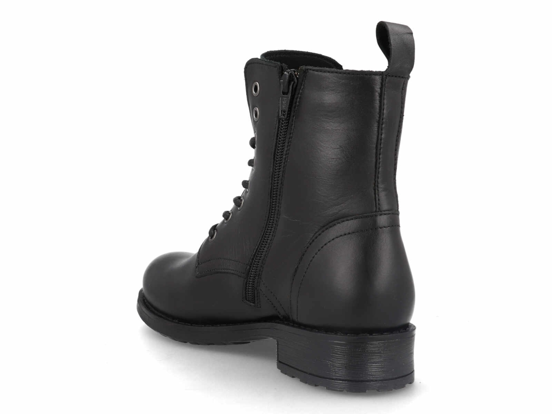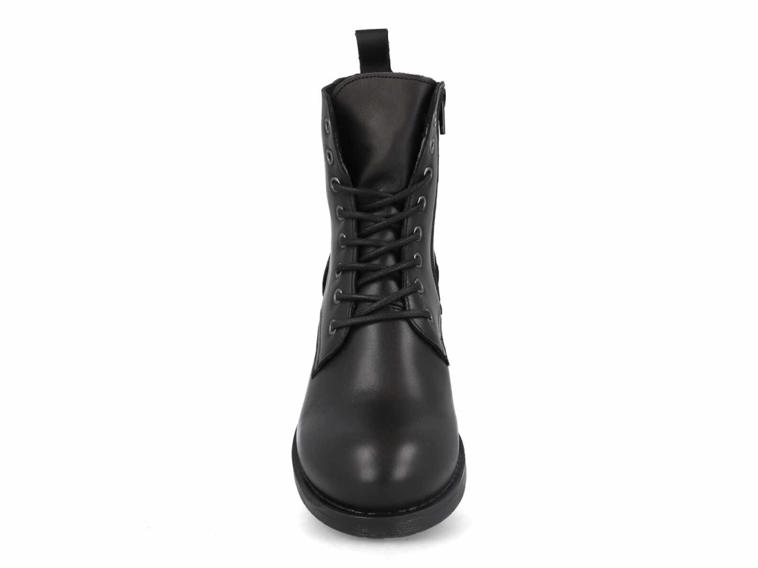 Su diseño superior mantiene la esencia robusta del botín tipo militar, con un acabado liso de aspecto premium y una construcción resistente que asegura durabilidad y firmeza. El sistema de cordones con ojales metálicos permite un ajuste personalizado, aportando un toque urbano y moderno que combina perfectamente con todo tipo de looks, desde jeans hasta outfits más atrevidos.