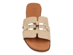 Sandalias planas de piel para mujer color oro con adorno oro, fabricadas en España por la marca Bda. Estilo, comodidad y calidad artesanal en cada paso.
