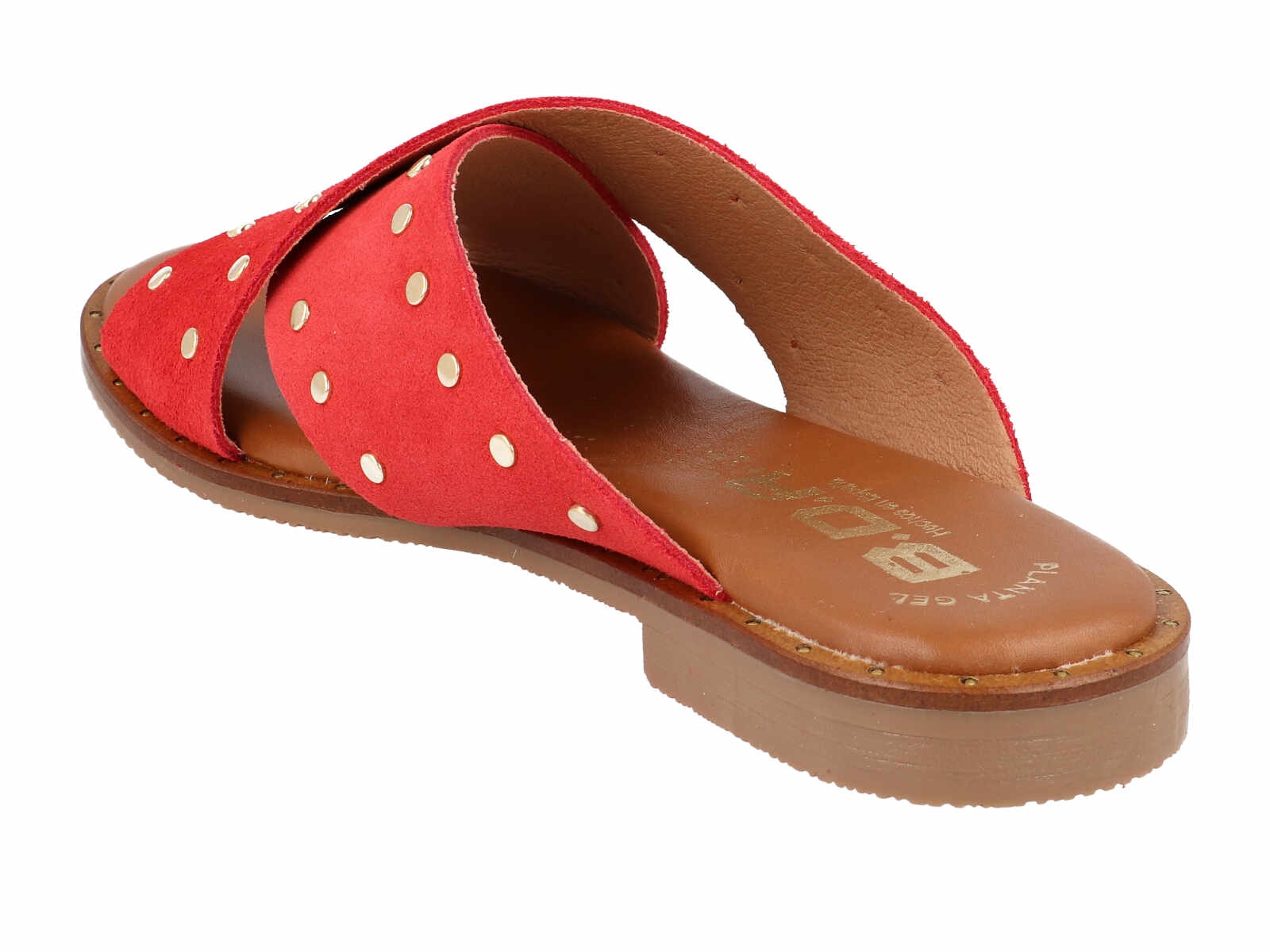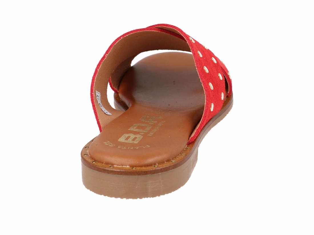 Eleva tu look diario con las sandalias planas Bda 11658 Rojo, el calzado esencial para este verano. Diseñadas para la mujer que busca un equilibrio entre comodidad y tendencia, estas palas destacan por su diseño de tiras cruzadas en piel de serraje de alta calidad y un sofisticado detalle de tachuelas doradas que aportan un aire moderno y bohemio.